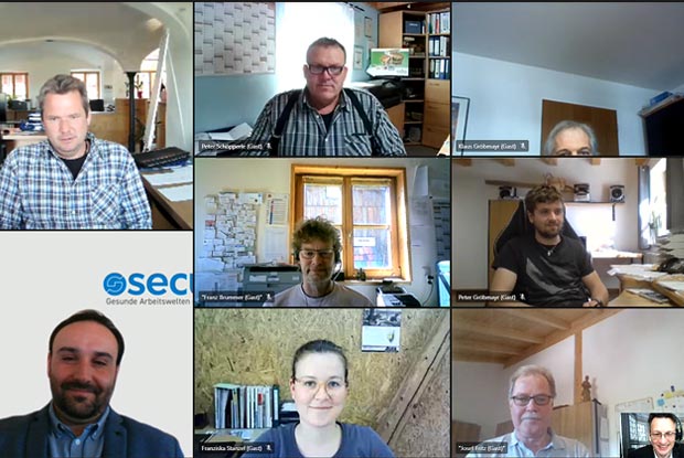 Beim Online-Seminar "Sicherheit mit einem Griff" lernten die Mitglieder der Zimmerer-Innung Ebersberg den Umgang mit der App DigitGB. Franziska Stanzel (Mitte unten) erzählt im Interview, inwiefern sie davon profitiert.