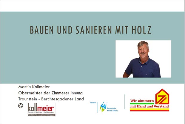 Der Obermeister der Zimmerer-Innung Traunstein/Berchtesgadener Land Martin Kollmeier hielt am 26. November 2020 einen Vortrag zum Thema „Bauen und Sanieren mit Holz“. Dieser fand im Rahmen der Online-Seminarreihe „Verbauen oder Verbrennen - Nachhaltig Bauen & Sanieren mit Holz“ der Energie Agentur Südostbayern Traunstein statt.